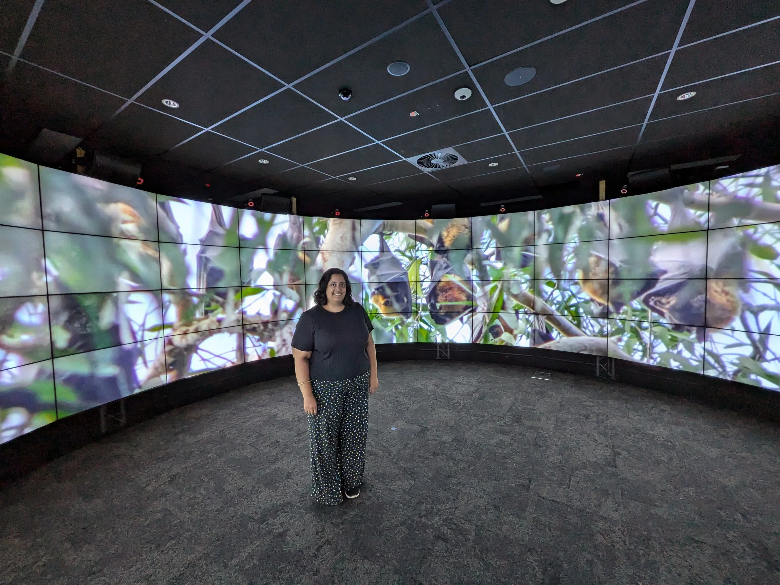 Natural Ecologies artist in resident Nikki Sheth prepares for her showing inside CAVE2 at UniSC. Photo courtesy of Nikki Sheth. Photo John Lucy.