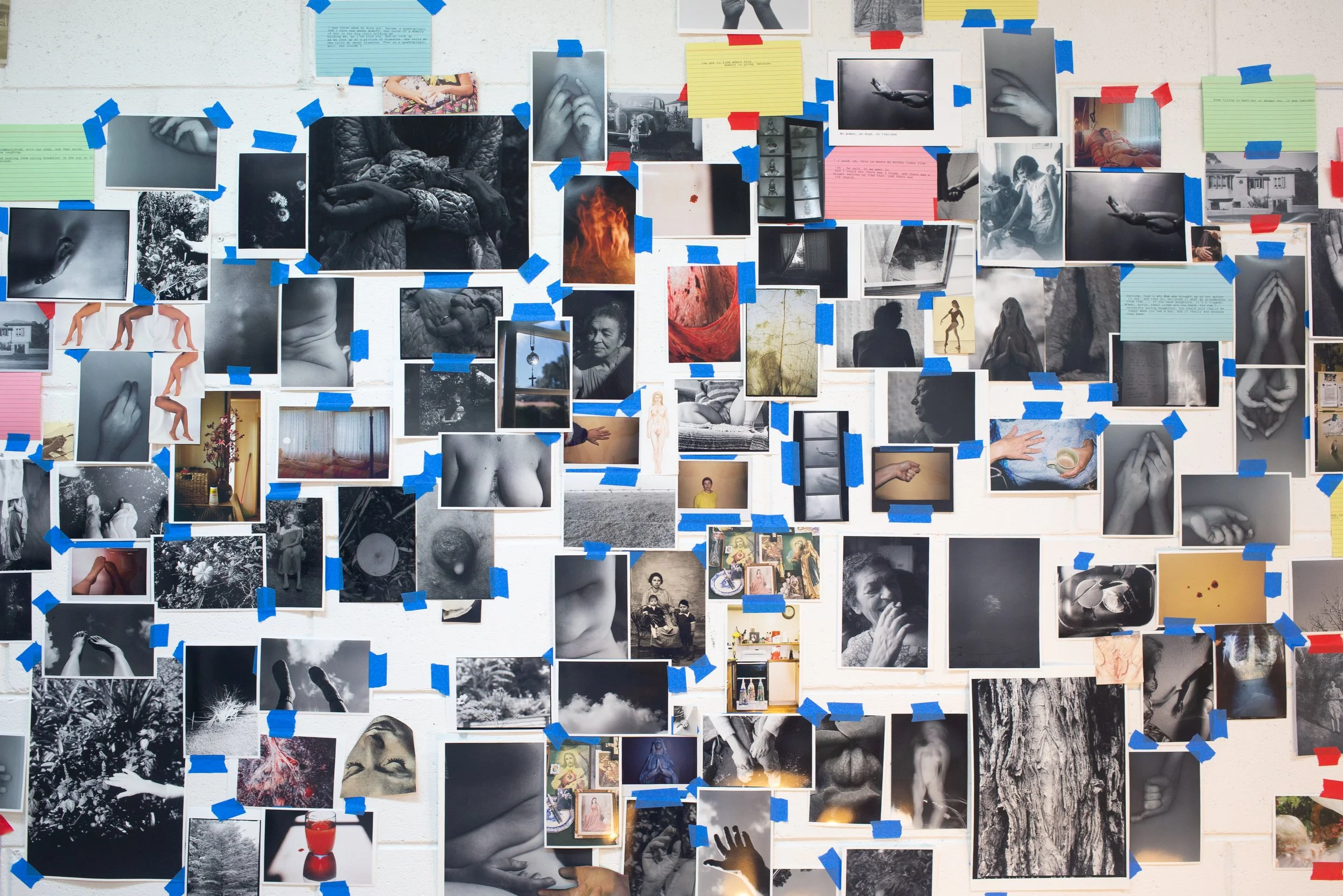 Julia shared with the audience the influence of Eve Kosofsky Sedgwick’s concept of texxture — spelled with two x’s — describing the layered interplay between materiality and meaning. As the stories told in the ‘in-between spaces’ of this work dive below the surface, the studio walls also indicate a material tactility - torn paper edges, soft grain images fading at their margins, handwritten notes, typed text on index cards. Each image has an artefact quality, leaning into the curated and ever-expanding conversation about what the maternal body holds and the stories it leaves behind.